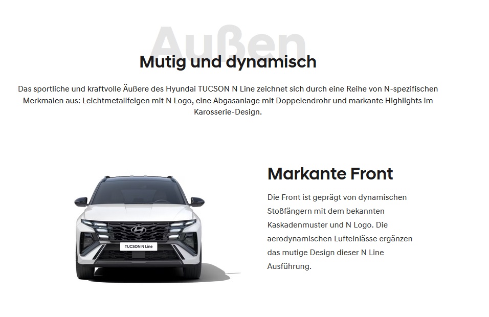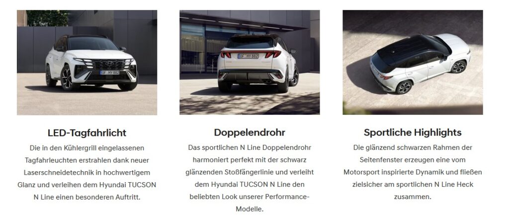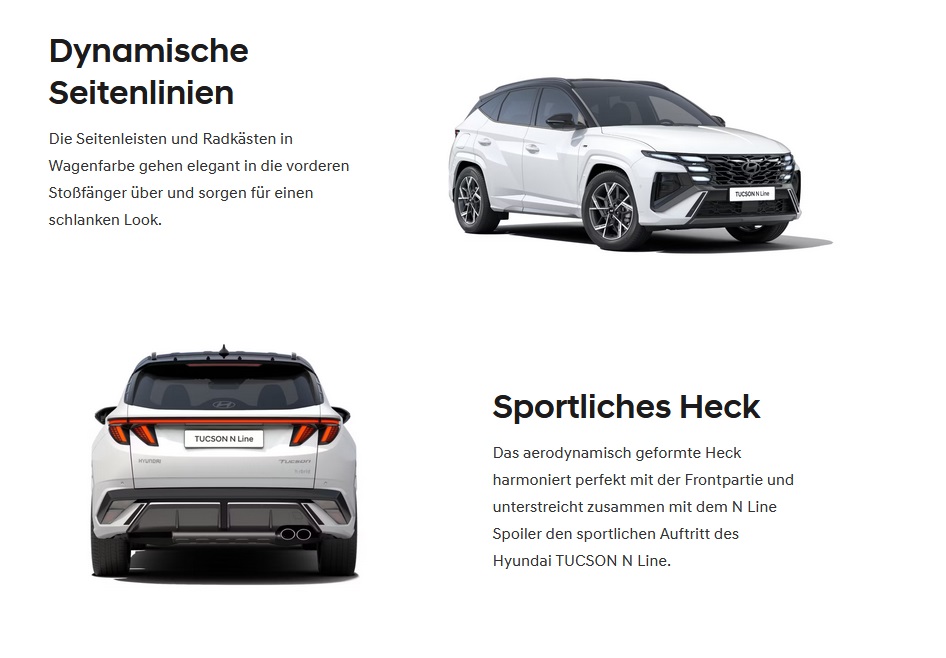 Im Black Week November steht der Hyundai Tucson ganz im Zeichen der Sportlichkeit: Sichere dir für kurze Zeit, attraktive Leasingraten für unsere Top-SUV. Dein Ausstattungs-Upgrade für den Hyundai TUCSON. Aus Trend wird N Line und aus Prime wird N Line X: Sichere dir bis zum 28.11.2025 den Hyundai TUCSON im Sport-Look.